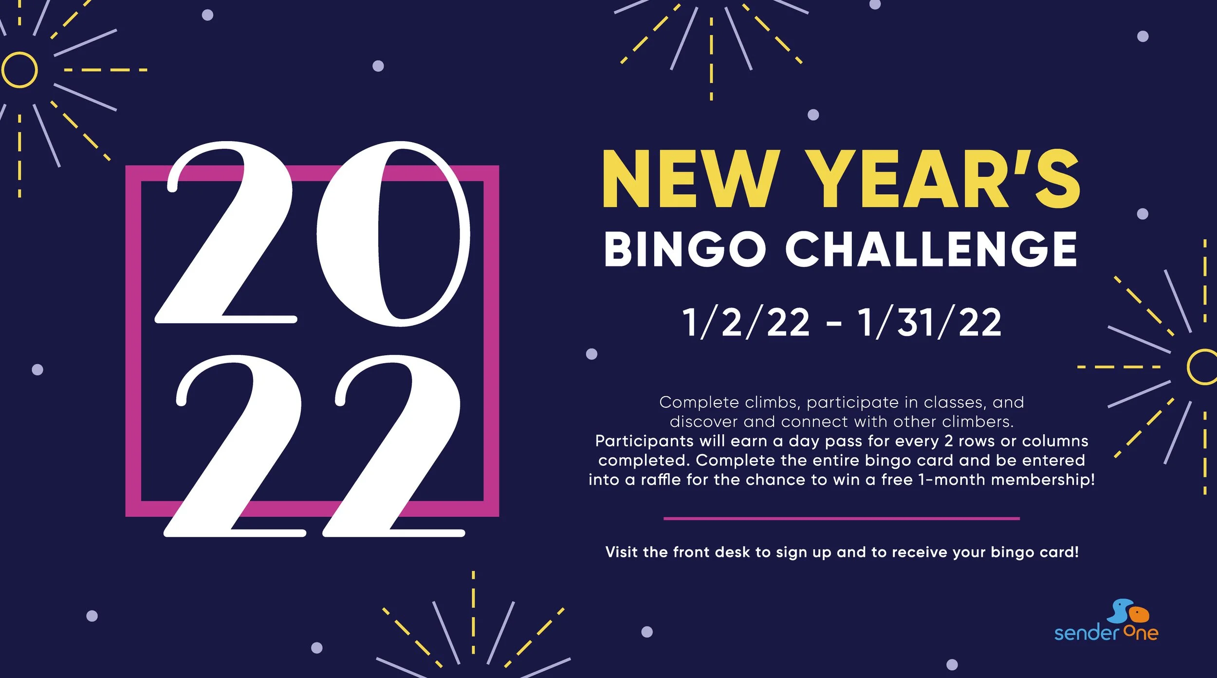 Get a jumpstart on your fitness and climbing goals with Sender One’s New Year’s BINGO Challenge starting on January 2nd through January 31st!