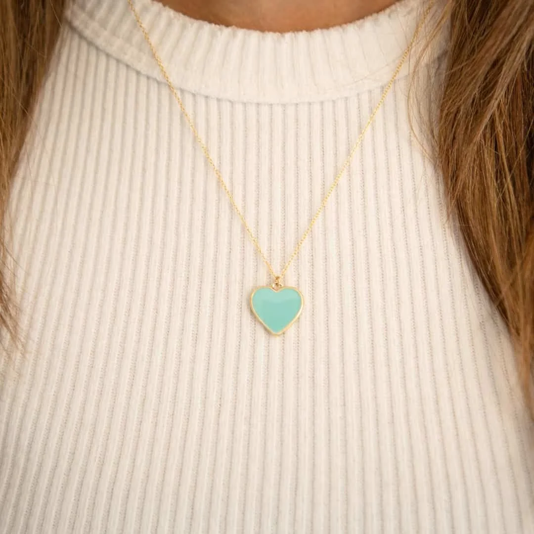 A turquoise enamel version of our black heart necklace on a small cable chain. Pair it with their Gold-Filled Mini Link Choker Necklace for a special deal.